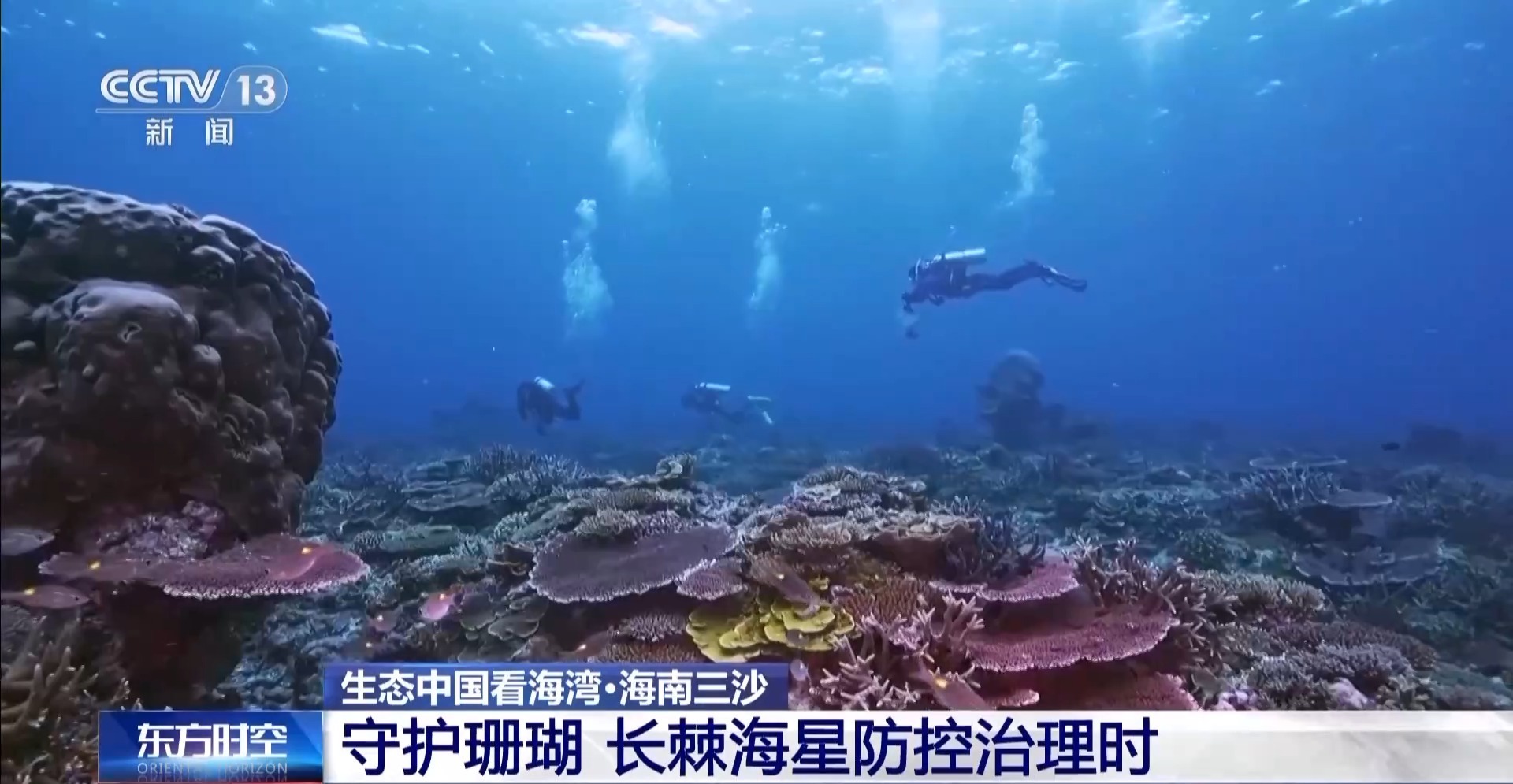 中国科学院南海海洋研究所西沙站工程师 杨清松:这个海星有十几只臂,臂上面的触手,它会伸出来,它把它的胃整个排出来,把珊瑚包裹住,把整个珊瑚的组织给消化掉,只剩骨骼了,这个跟珊瑚白化不一样,吃掉就没办法了。