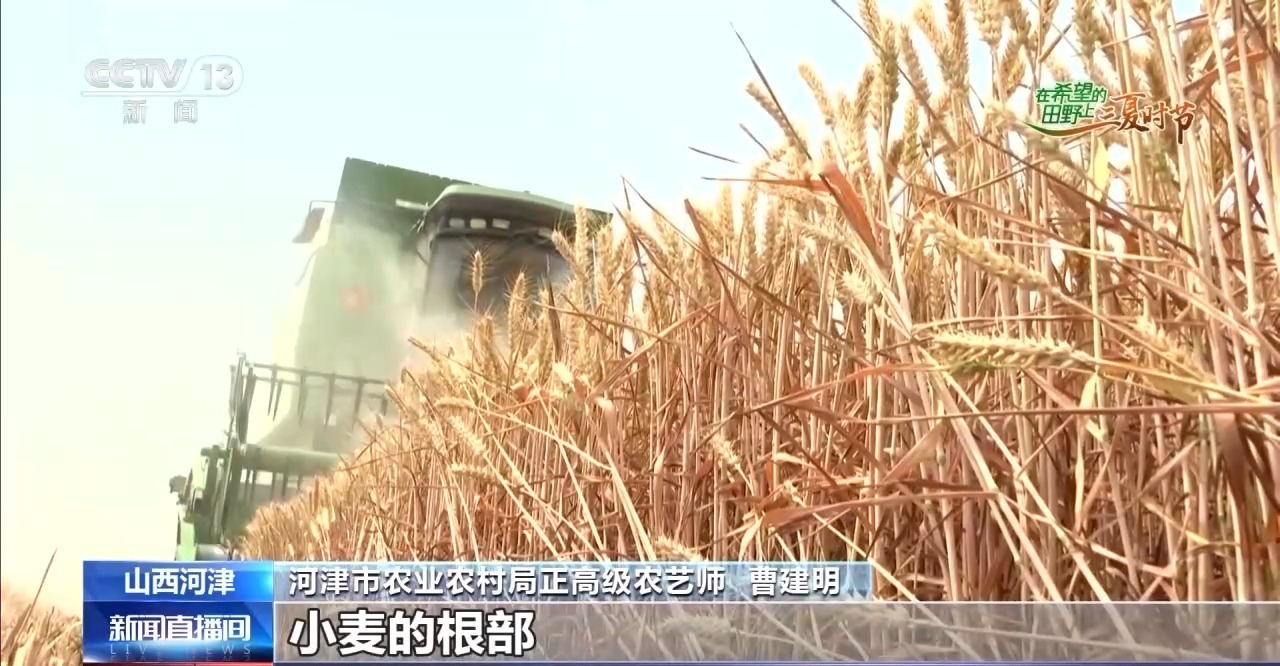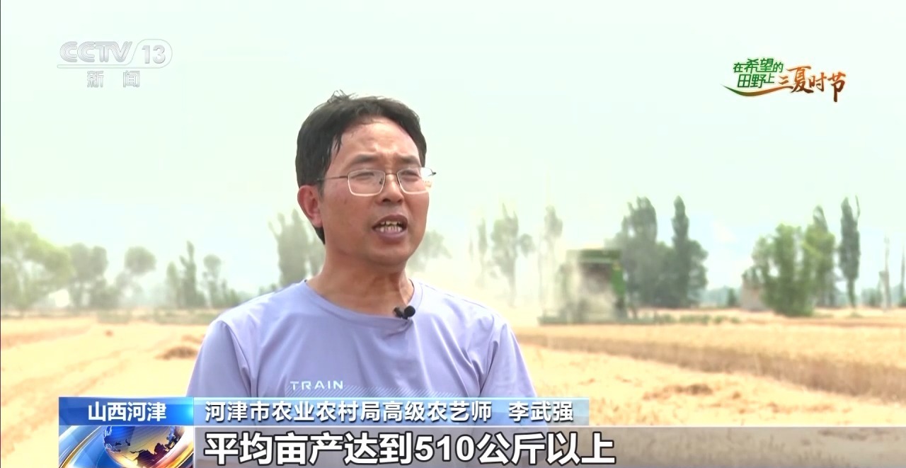 河津市农业农村局高级农艺师 李武强:示范基地的小麦估计一周左右全部收完,平均亩产达到510公斤以上,较去年增产8%。下一步,将持续加大实用技术应用,努力实现‘收到手’到‘收得好’转变。