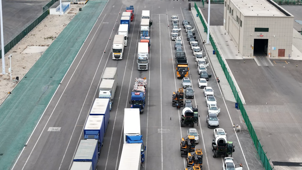 在霍尔果斯公路口岸,货车、商品车、工程车等排成长龙,从中国驶向哈萨克斯坦。