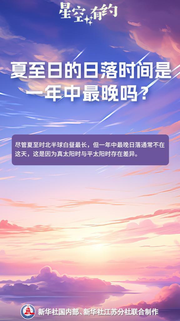 尽管夏至时北半球白昼最长,但一年中最晚日落通常不在这天,这是因为真太阳时与平太阳时存在差异。王科超解释道,“日出而作,日落而息”所依据的真实太阳运动时间称为真太阳时。在真太阳时系统中,夏至日确实是日出最早、日落最晚的一天。然而,由于真太阳时的不均匀性,我们日常所用的是以假想的太阳平均运动为依据得到的平太阳时。如此一来,每天都有均等的时长,即24小时。