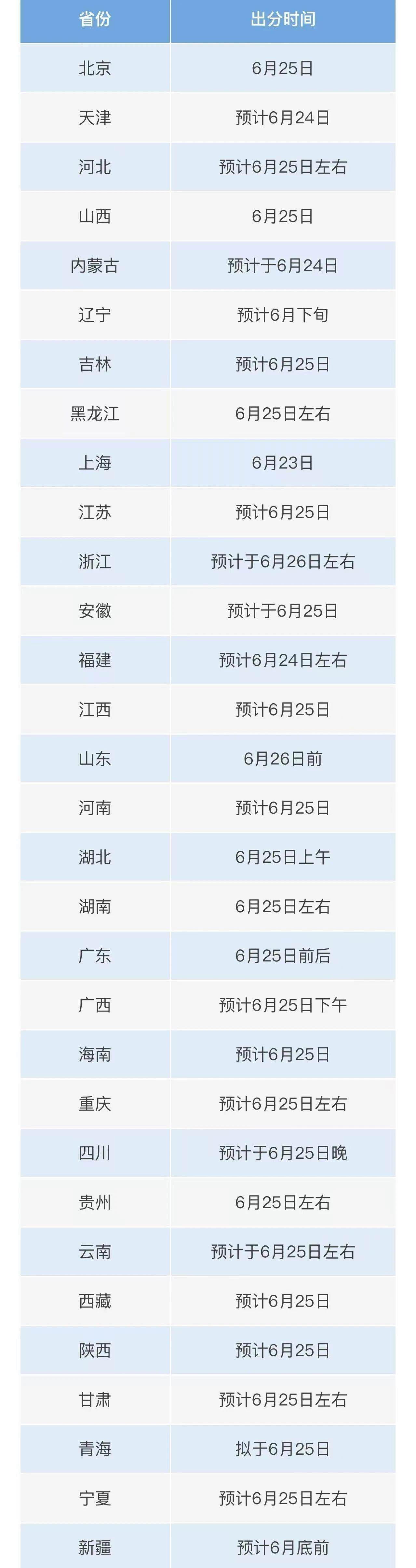 31个省份高考成绩查询时间