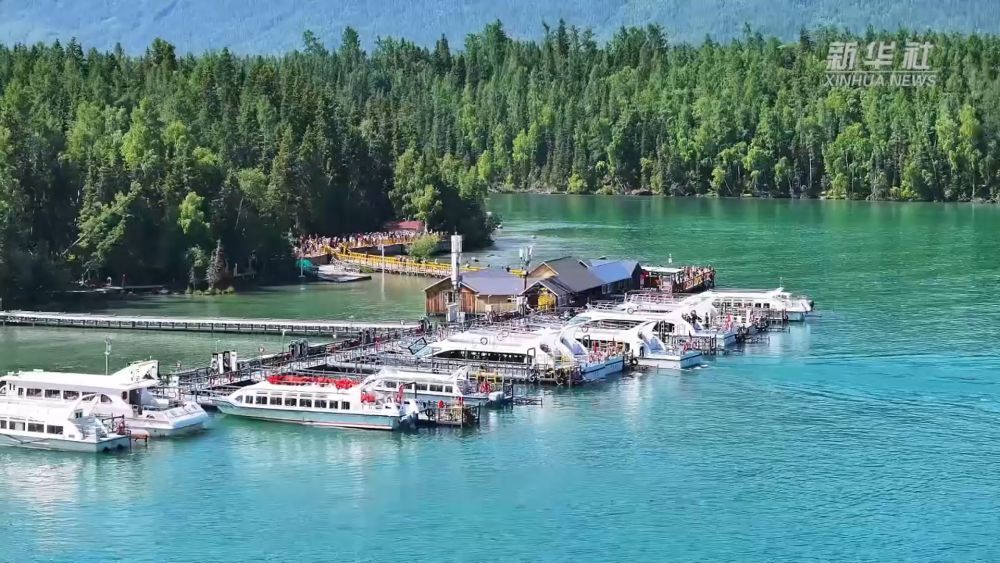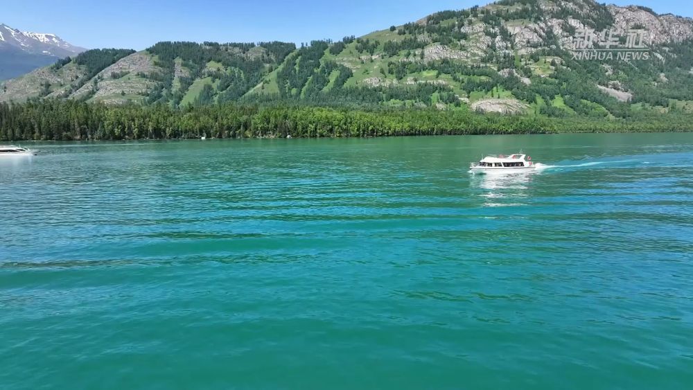 在碧波荡漾的新疆喀纳斯湖里,一艘艘全电观光游船正载着游客欣赏着这里独特的湖光山色。