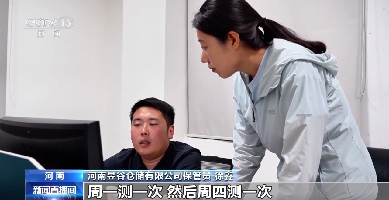 河南昱谷仓储有限公司保管员 徐鑫:周一测一次,周四测一次。我们会通过这两次的数据跟上一周的测温数据进行对比,检测一下看看是不是某一个点有不正常的发热现象,进行降温通风处理。