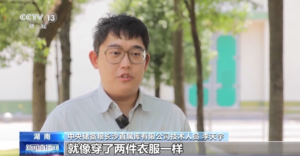 中央储备粮长沙直属库有限公司技术人员 李天宇:我们的气膜仓相比于浅圆仓就像穿了两件衣服一样,一件是棉衣用来保温,另外一件就像雨衣一样,它可以减少外界的水分侵入到粮食之中去,而且通过氮气气调技术也会良好地将气密性做到长久常新的状态。