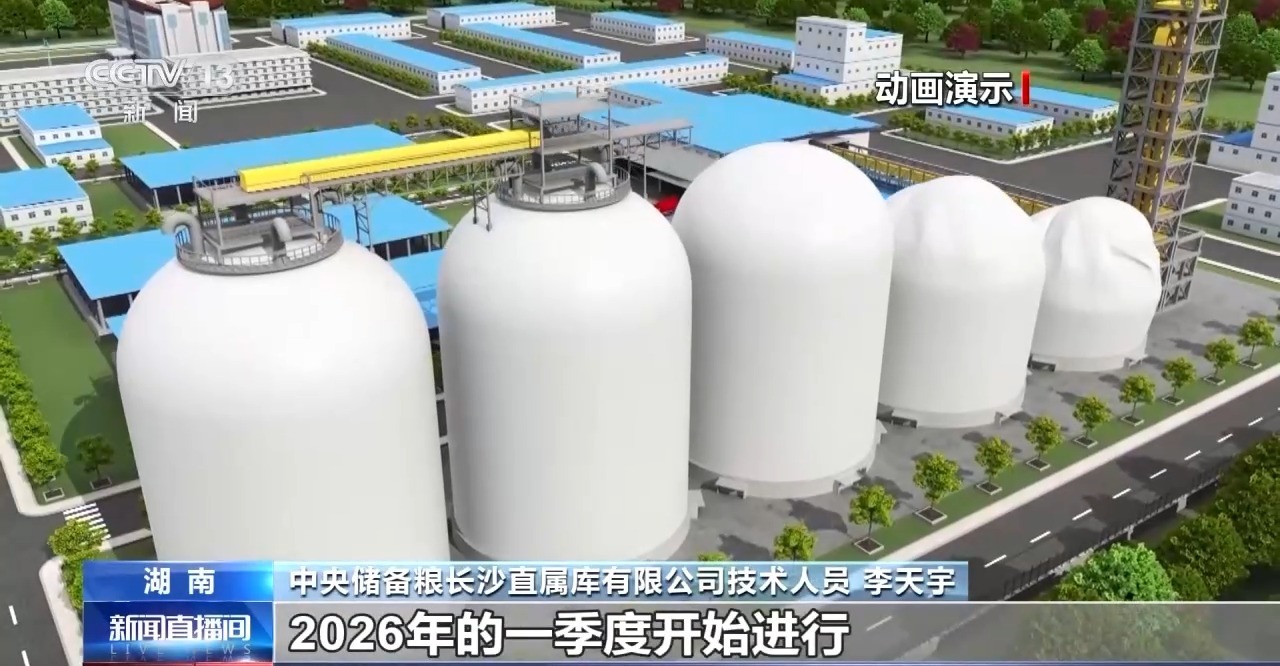 中央储备粮长沙直属库有限公司技术人员 李天宇:总体施工进度差不多完成了60%,预计今年年底会完成施工,我们的装粮计划是在2026年的一季度开始进行。