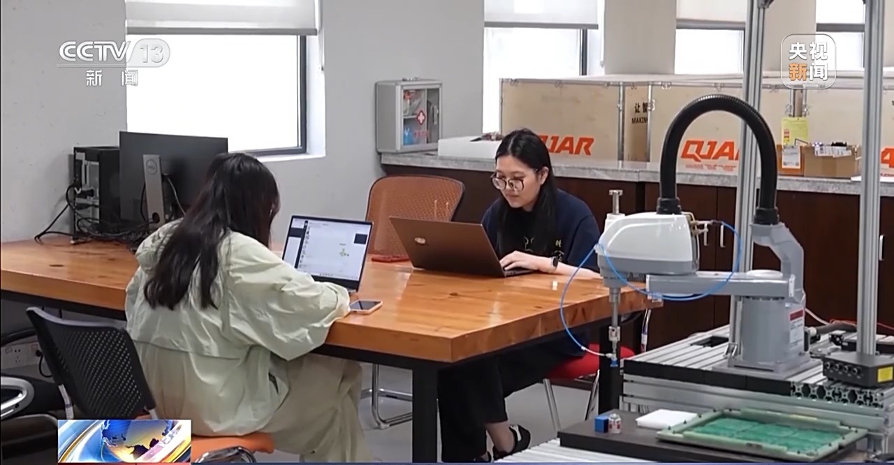 在杭州电子科技大学工业互联网研究院,研究生朱东来正和团队成员一起优化智能上料机器人,让机械臂可以丝滑地抓取木板并放到传送带上。