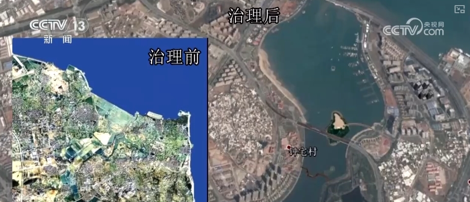 原先在五缘湾的内湾,几乎看不见海水,里面遍布着密密麻麻的长方形格子,也就是养殖鱼塘。而原先这片被堵死的水域现在碧波万顷,两岸绿意盎然,建筑规划合理有序。