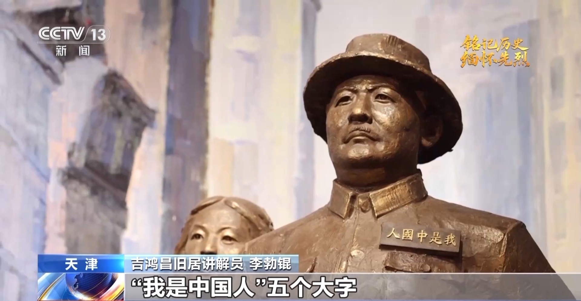天津吉鸿昌旧居讲解员 李勃锟:吉鸿昌在美国前往邮局想往国内邮寄包裹时,邮局的工作人员竟故意声称不知有中国这个国家,吉鸿昌将军十分愤怒。回到住所之后,将军找来一块木牌,在上面工整地刻下了“我是中国人”五个大字,并将其佩戴在胸前,昂首挺胸地出入于大庭广众之中。