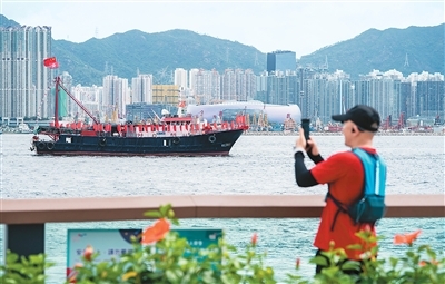 七月一日,由香港各界庆典委员会组织的二十八艘渔船在香港维多利亚港海面巡游。