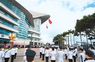 7月1日清晨,从香港金紫荆广场、到各中央驻港机构驻地、到社区会堂,再到各个大学的礼堂,庄严的国歌声在香港多地响起,一面面鲜艳的五星红旗冉冉升起。