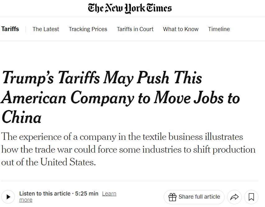 文章说,特朗普政府发起的全球贸易战动摇了Cocona Labs公司的经济基础。受到美国关税不确定性的影响,加之中国实施的对等反制措施,这家美国公司将开始做出改变:将其核心产品的部分生产从美国转移到中国的工厂生产。