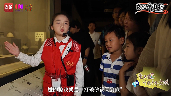 在南京市博物馆,穿着宽大的“小灵星”马甲的志愿讲解员徐彬清正在跟着工作人员一起挖掘文物背后的故事。经过“打破砂锅问到底”的努力,她把文物故事转化成小朋友都爱听的有趣表达。