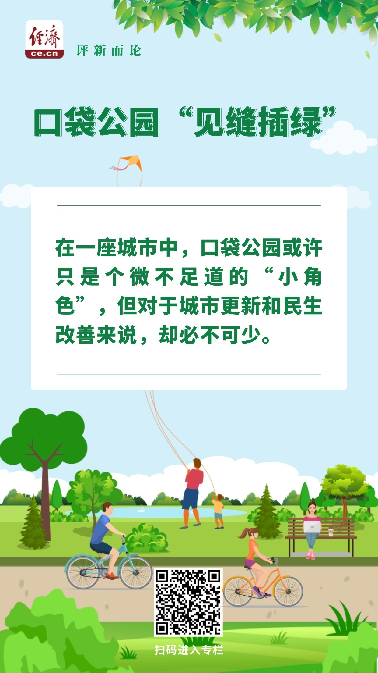 口袋公园,顾名思义,就是形容公园面积小,像衣服上的口袋一样。如今,越来越多的城市通过挖掘城市边角地等空间,因地制宜推进“公园+文创”“公园+体育”和“公园式”商场等建设,更好满足群众的需求。“榆柳荫后檐,桃李罗堂前”不再只存在于诗歌中,推窗见绿、出门即景,家门口也可以是“诗和远方”。
