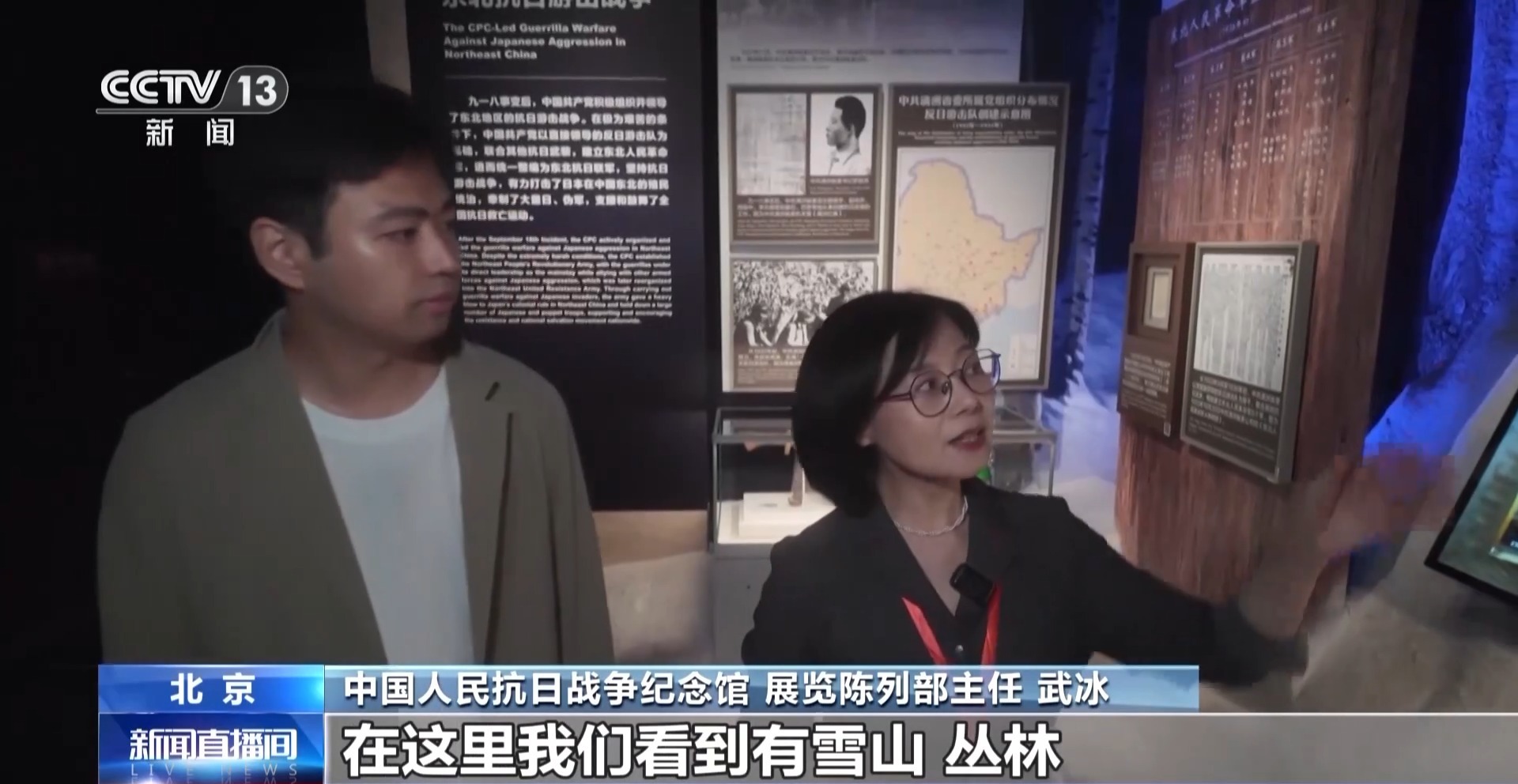中国人民抗日战争纪念馆 展览陈列部主任 武冰:现在我们来到的这个空间就是东北抗联,在这里我们看到有雪山、丛林,在这里还增加了松树的树种,图片、文物全部放置在了雪山当中。观众在行进过程当中,会有一种破雪前行、历史画面慢慢地呈现出来的感受。像这样的综合性的景观打造,在整个展览当中大概有十余处。