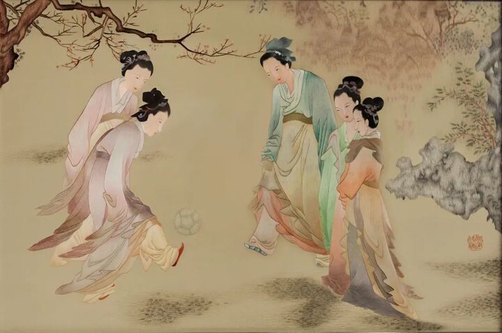 在展演中,姚卓还用创新针法现场绣制《仕女蹴鞠图》。这幅作品的原作是由她的母亲——苏绣国家级非遗代表性传承人姚建萍创作,其题材取自明代画家杜堇的一幅名作,刺绣大师采用经典的双面绣手法,展现了明朝中国女性在花园里蹴鞠的美好画面。这幅原作于2017年1月18日被作为国礼赠送给国际奥委会,并永久陈列在国际奥委会总部奥林匹克博物馆。