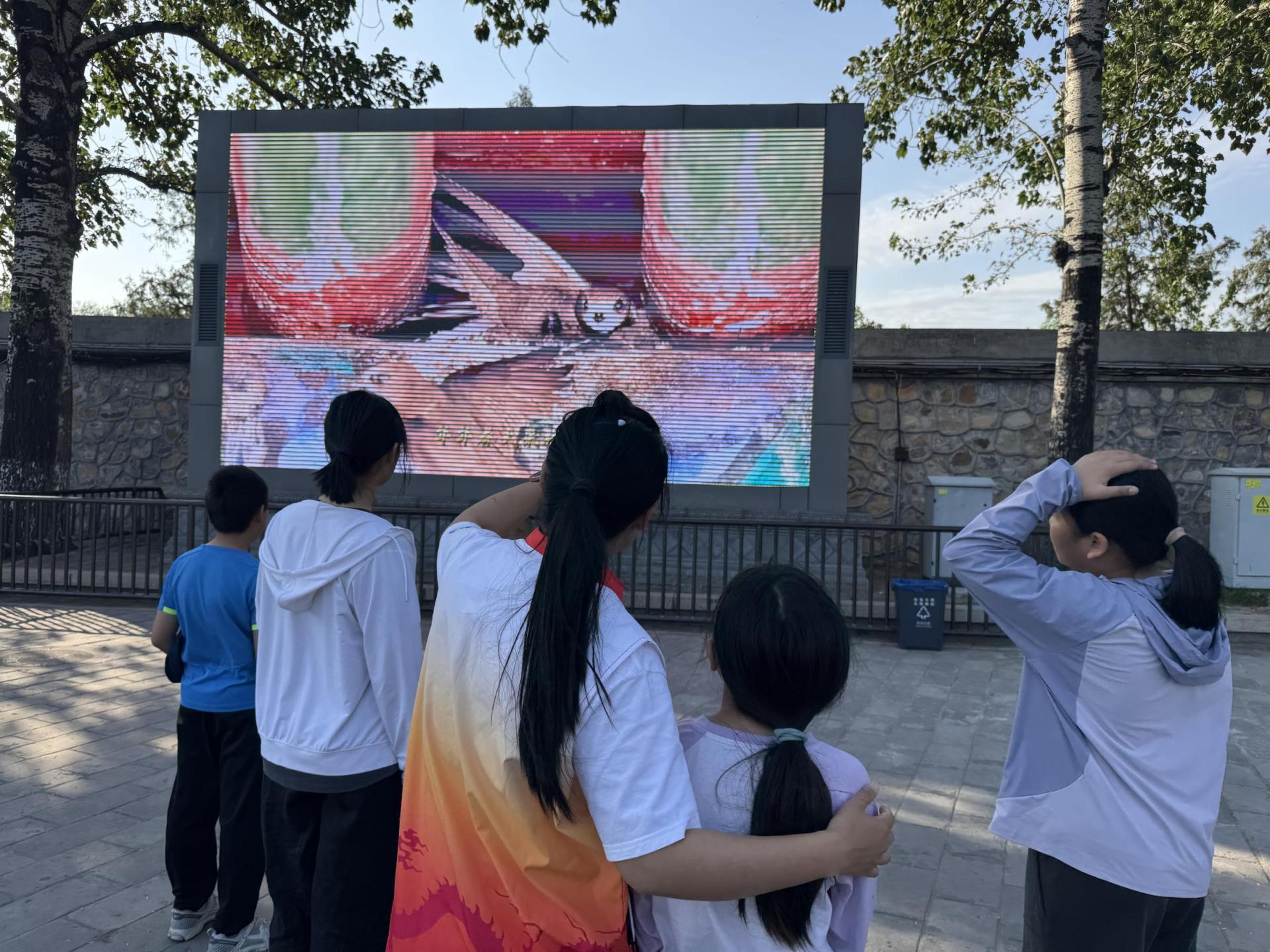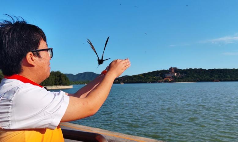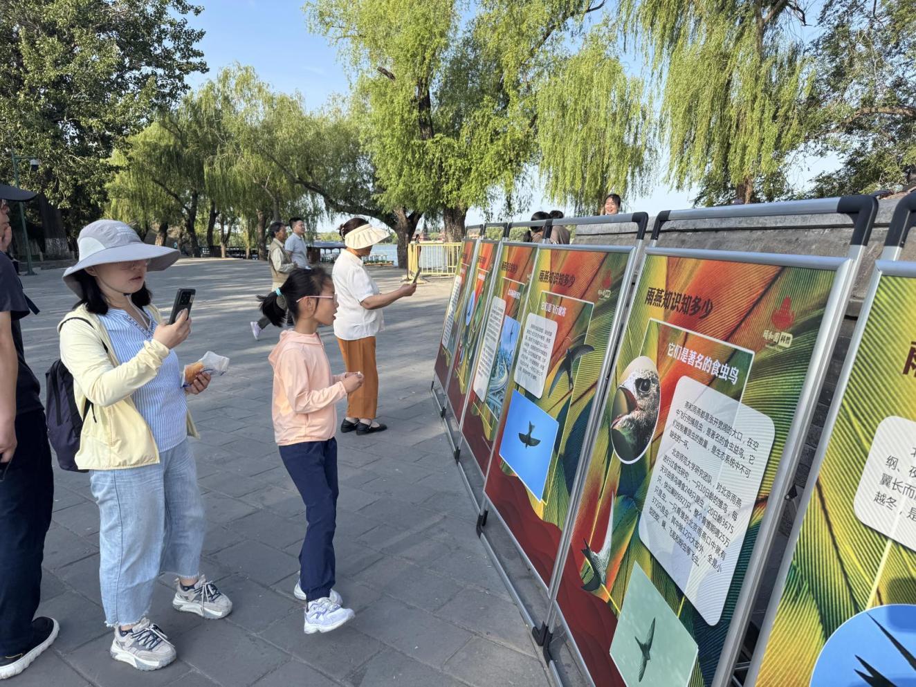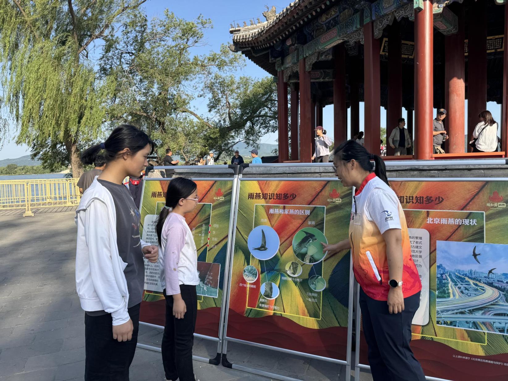 环志工作紧张有序进行的同时,廓如亭外围的科普活动成为晨光中的生态课堂。北京雨燕知识展板吸引游客驻足,颐和园科普讲师生动讲述雨燕迁徙知识、环志科研意义。廓如亭对面的科普大屏以低音量循环播放着科普MV《北京雨燕》,颐和园的湖光山色与学生们真挚的演唱相互映衬,让公众直观感受“古建住户”的生态魅力。