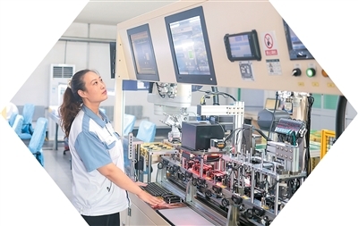 7月7日,在山东省荣成市一家外资电子制造企业生产车间内,工人正在操作智能电子设备赶制出口产品。李信君摄(人民图片)