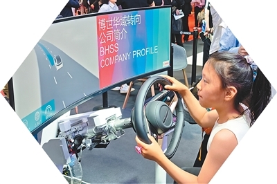 在第二十一届上海国际汽车工业展览会上,一个小女孩在德国博世展台体验模拟驾驶。刘春晖摄(人民图片)