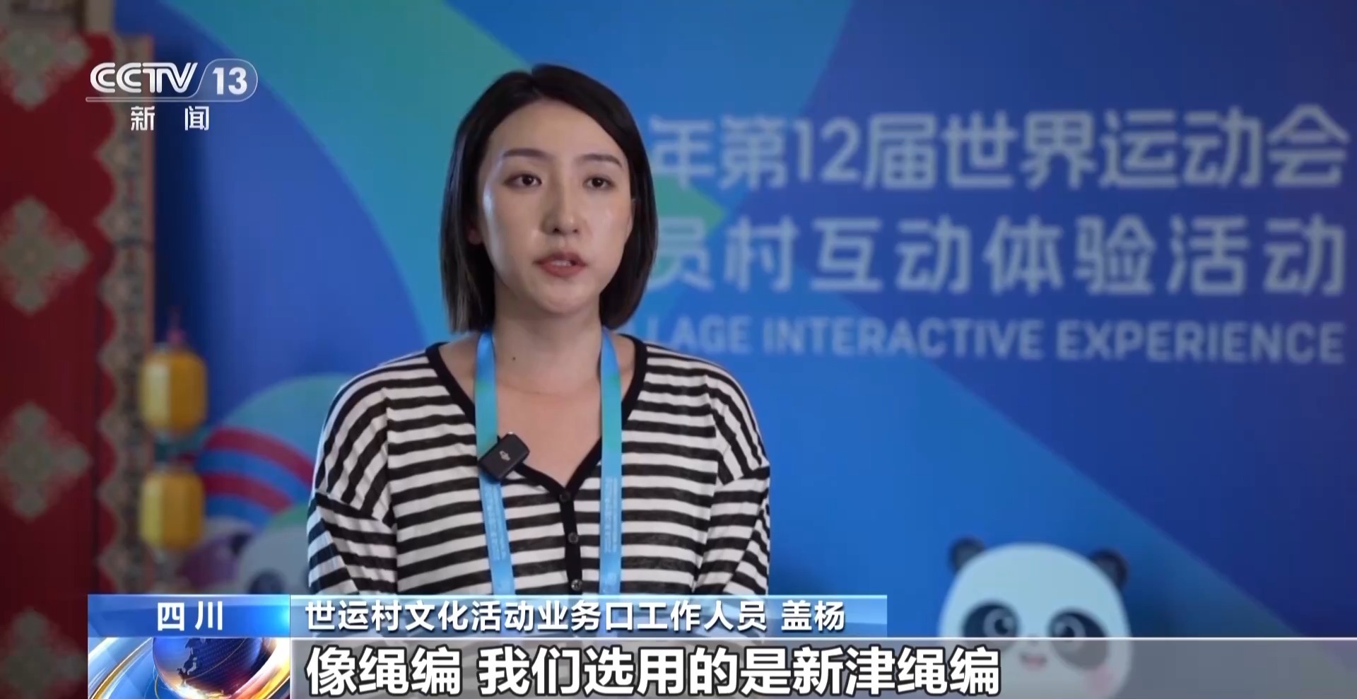 世运村文化活动业务口工作人员 盖杨:像绳编,我们选用的是新津绳编,编的是平安如意结。像剪纸,我们剪的是世运会的两个吉祥物,蜀宝跟锦仔。传统文化这个板块的设计上主要是以国风国画的形式来整体展现。包括我们想要表达出来的一些优秀传统文化的诗句,都是以毛笔字的形式进行展现的。