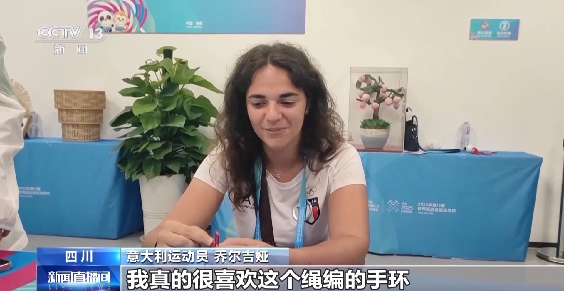 意大利运动员 乔尔吉娅:我真的很喜欢这个绳编的手环,对我来说还挺容易的,这是我在成都的一次很有趣的体验。