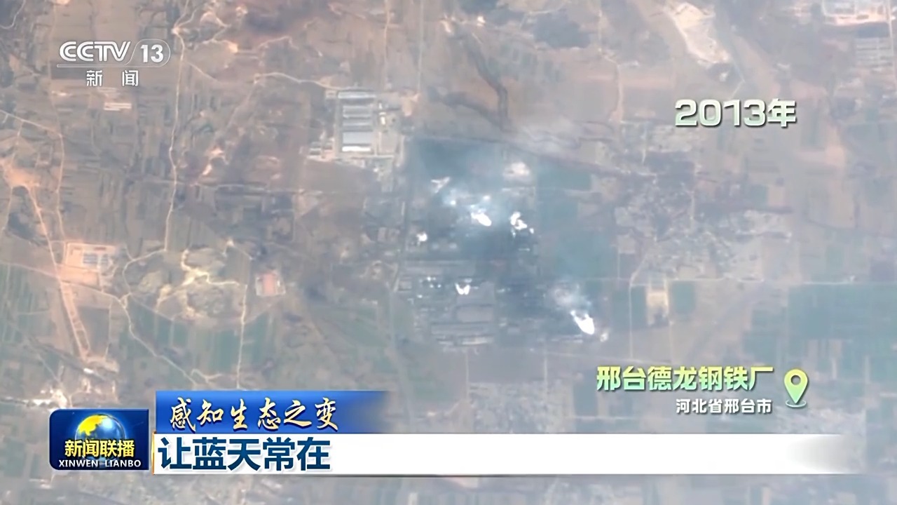 这是当时,环境监测卫星拍到的德龙钢铁厂,雾霾最严重的时候几乎看不出厂区轮廓。而如今,却是清晰可见,绿意葱葱。