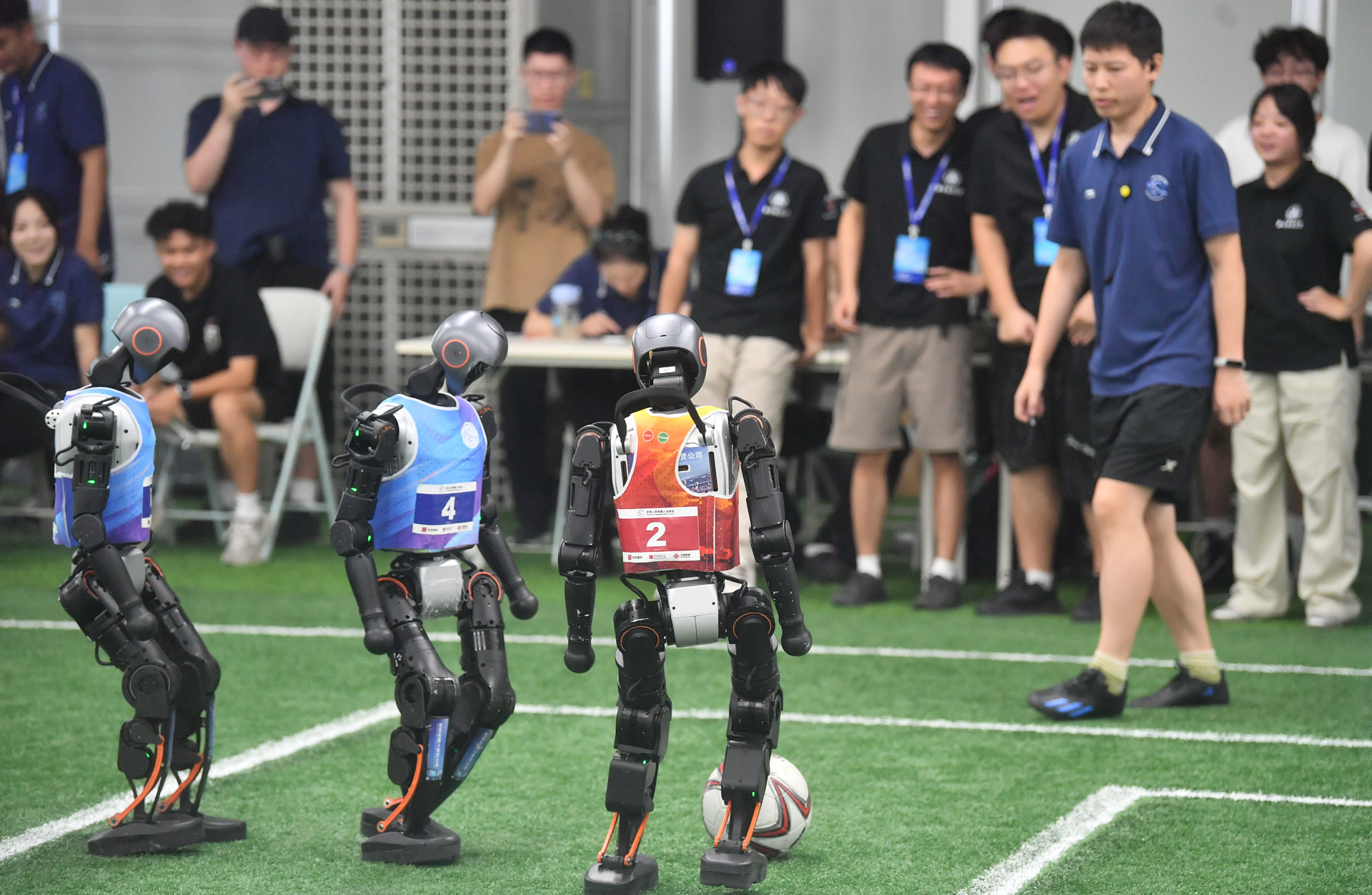 比赛哨声一响,身姿灵活的机器人“球员”马上活跃起来。它们通过脑袋上的摄像头“眼睛”寻找到足球位置后,迈着小碎步,快速向足球移动。“球员”们很快就会短兵相接,上演激烈身体对抗。这时候,机器人可能就会因此倒地,那些能够自动站起的可继续比赛,而无法自主起来的则会被临时罚下,确保比赛流畅进行。有的机器人则会通过灵活调整身体的角度和方向,寻找新的进攻机会。进球后,机器人还会挥舞着“手臂”进行一番庆祝。
