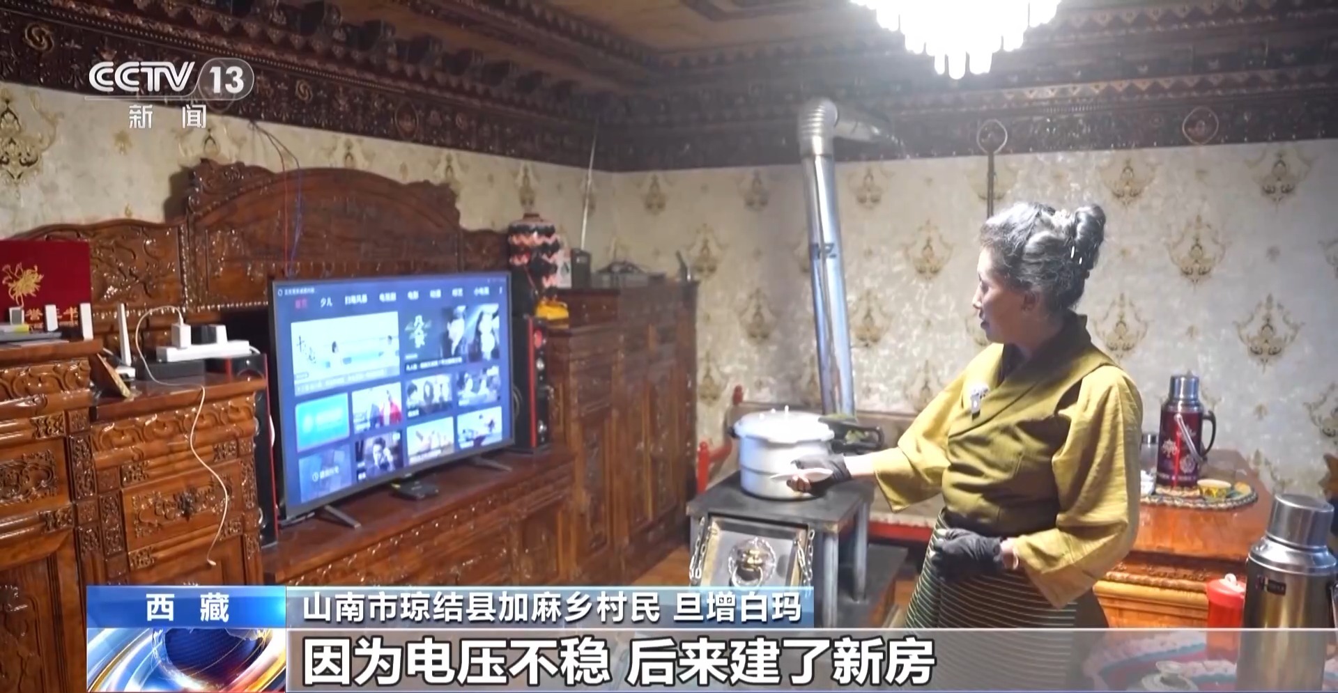 山南市琼结县加麻乡村民 旦增白玛:这个是2023年新建的,这边是以前住的地方,只有一个灯泡,其他家电也不敢用,因为电压不稳。后来建了新房,现在电压稳了,可以放心看电视,而且还买了很多新家电,冰箱、洗衣机、电视。