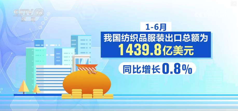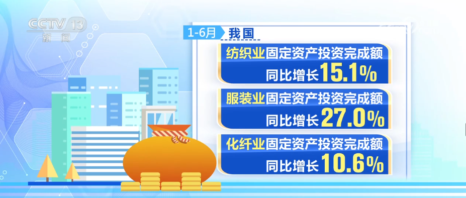 纺织业、服装业、化纤业固定资产投资完成额同比分别增长15.1%、27%和10.6%。1—6月,我国纺织品服装出口总额为1439.8亿美元,同比增长0.8%。