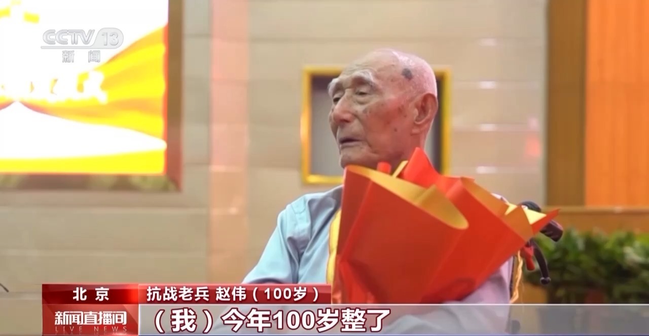 抗战老兵 赵伟(100岁):我今年100岁了,8月15日就是100岁,国家又给我一个生日礼物。