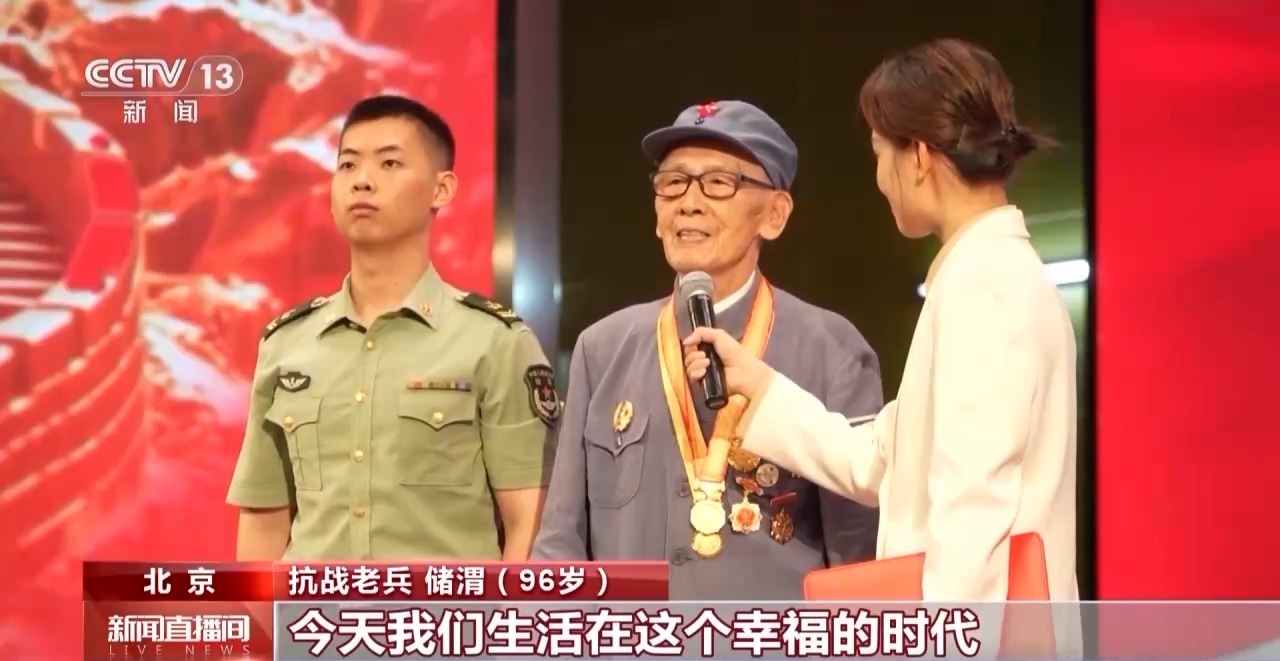 抗战老兵 储渭(96岁):我当兵的时候不到15岁,现在老战友已经不太多了。经历了14年的抗日战争,今天我们生活在幸福的时代,这是党的关怀,这是我们不能忘记的。