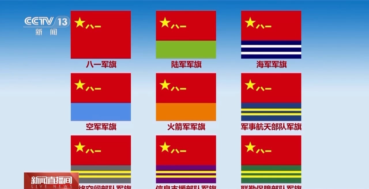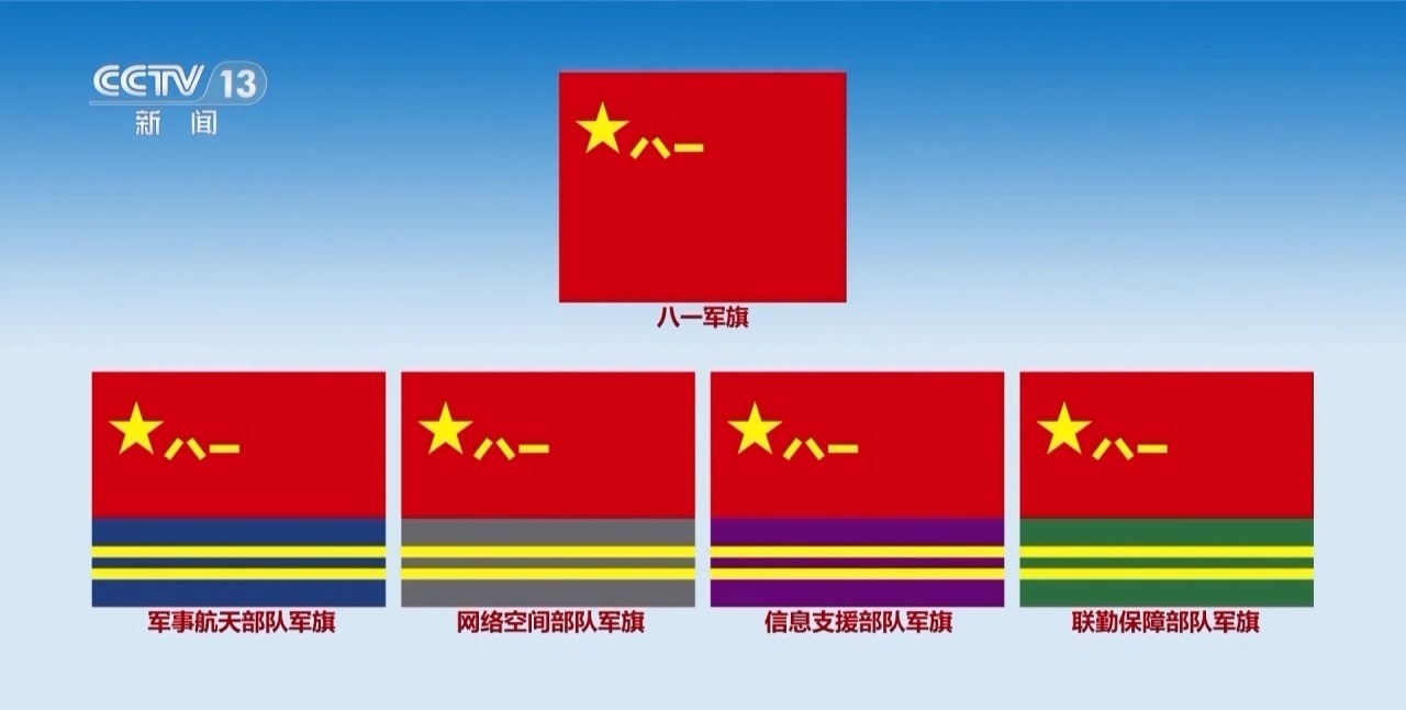今年七月,我军发布了军事航天部队、网络空间部队、信息支援部队、联勤保障部队军旗旗面式样。本次阅兵,受阅方队将擎各自军旗和武警部队旗,全方位展示我军军事力量。