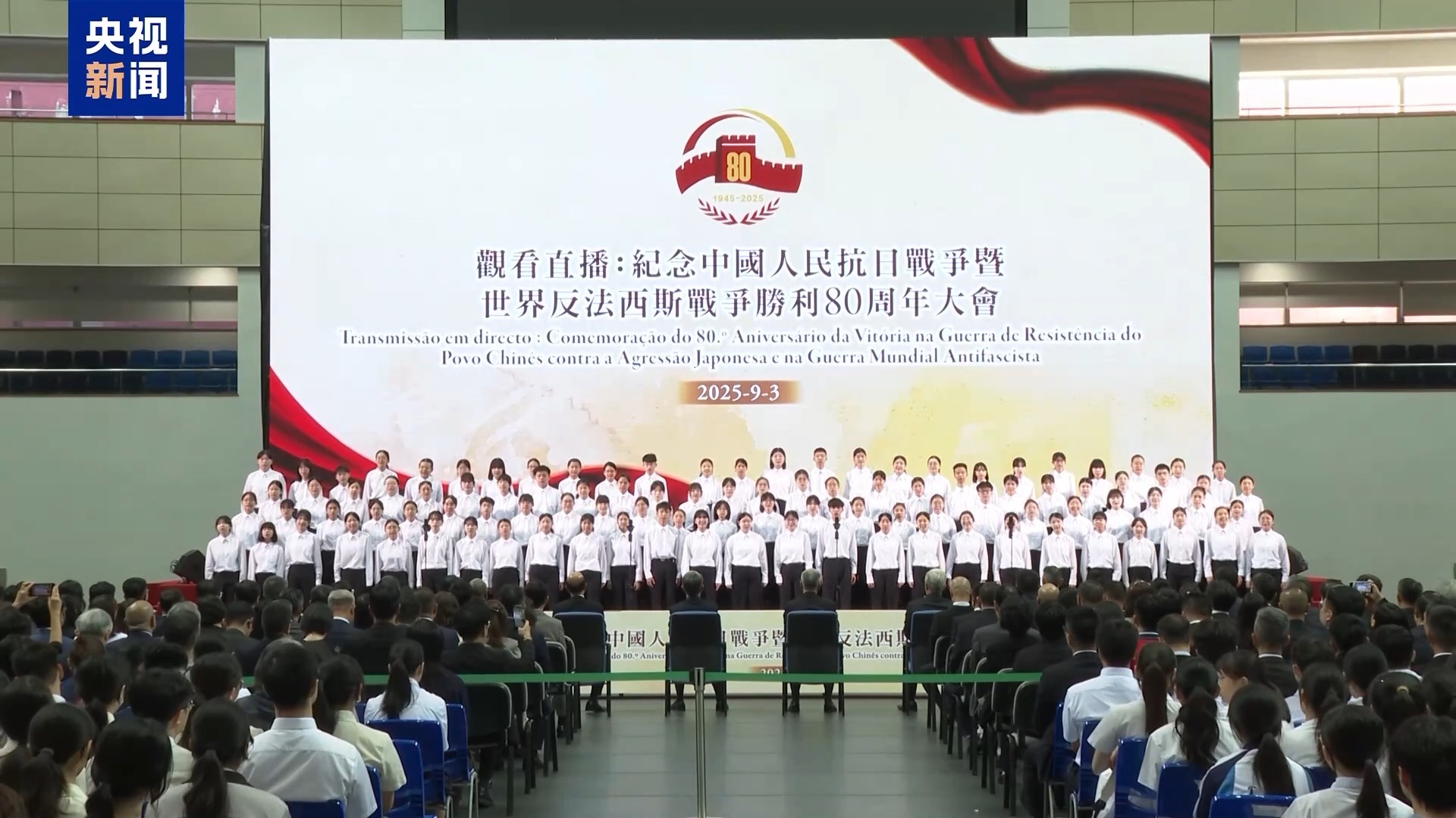 9月3日上午8时,香港特区政府在香港大会堂纪念花园举行官方仪式,纪念中国人民抗日战争暨世界反法西斯战争胜利80周年。澳门特区政府于9月3日上午,在澳门理工大学和澳门大学同步举行仪式,组织特区政府官员、社团、青年和学生代表等社会各界人士共同观看纪念中国人民抗日战争暨世界反法西斯战争胜利80周年大会的直播。