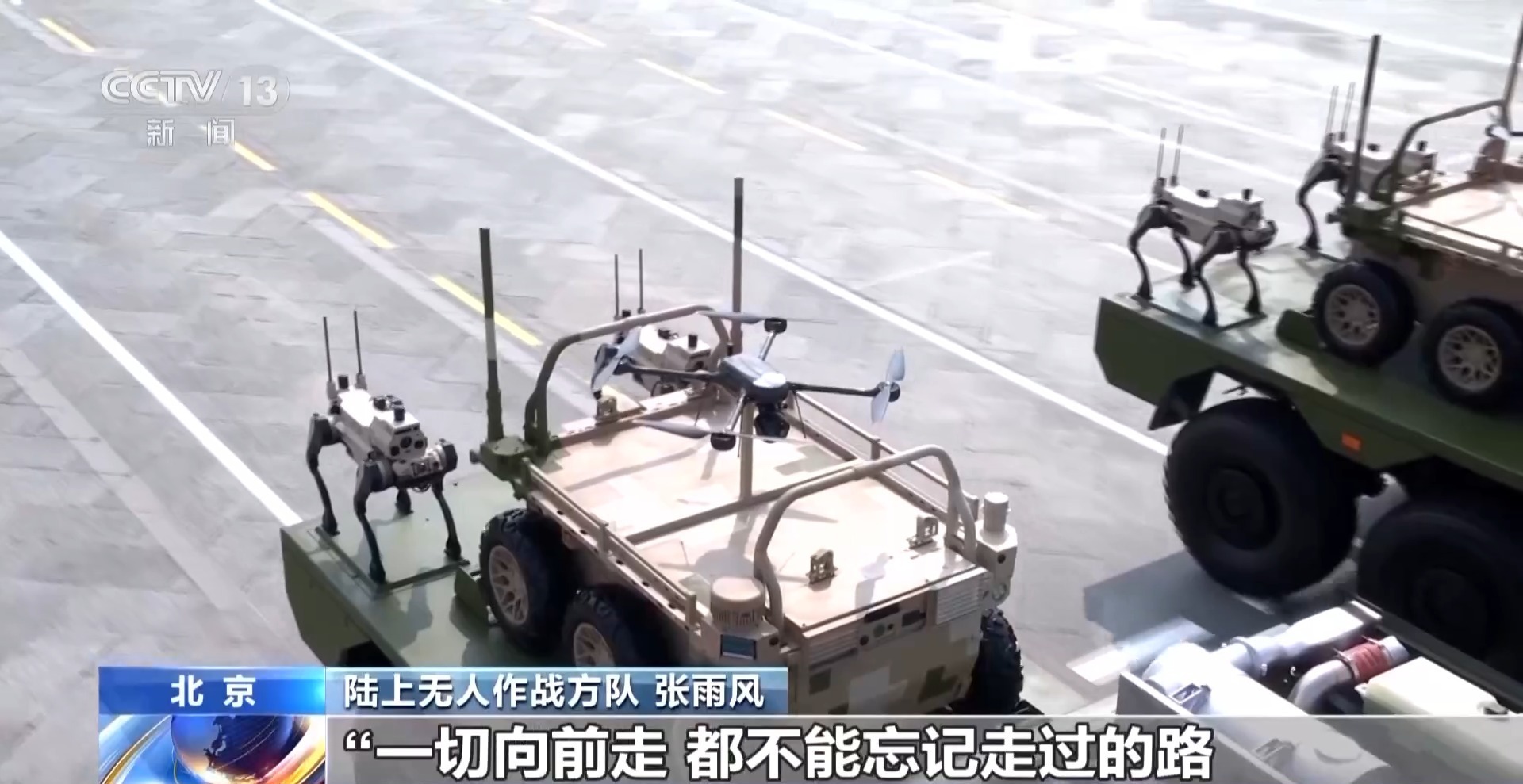 陆上无人作战方队 张雨风:如今,我们拥有了先进的武器装备,更要牢记中华民族一路走来的艰辛,牢记人民军队使命初心,弘扬好抗战伟大精神,把手中先进武器装备转化为部队实际作战能力,聚力打赢实现建军一百年奋斗目标攻坚战。