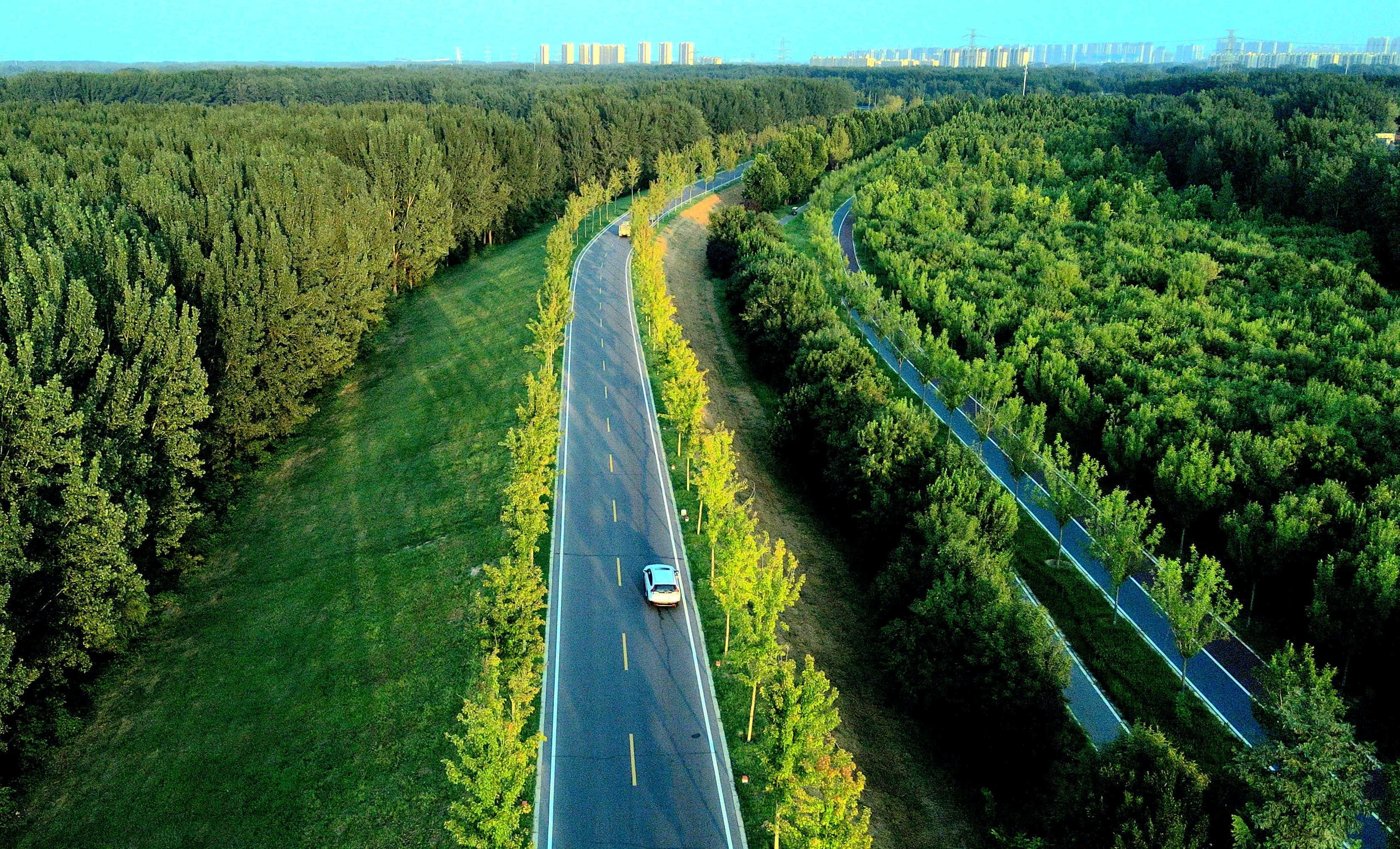 绿树成荫的郑州黄河大堤上,一边是奔腾向东的黄河,一边是平坦的公路。黄河生态廊道犹如一条绿色的飘带与蜿蜒的黄河相伴,美不胜收。