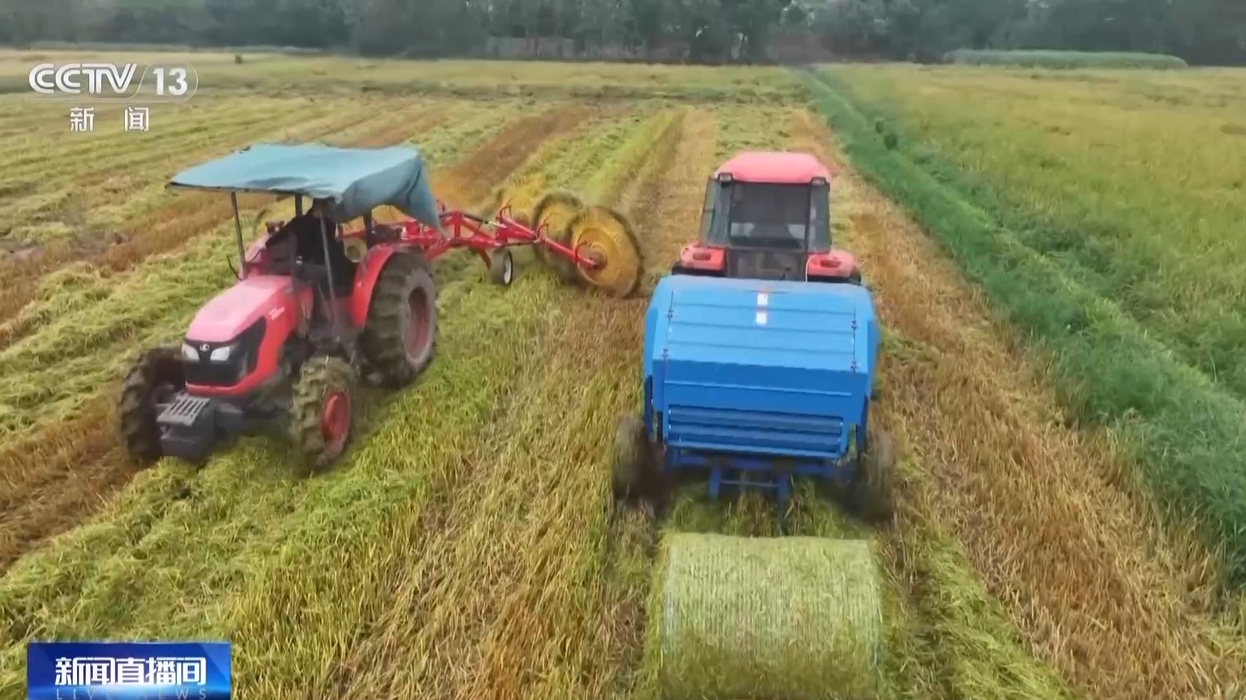 在推进晚稻抢收抢烘的同时,当地还同步开展秸秆综合利用。搂草机和打捆机协同作业,将散落田间的稻草规整收集、压实捆扎,便于运输储存。这些秸秆每亩可为农户增收100多元,实现了生态效益与经济效益双赢。
