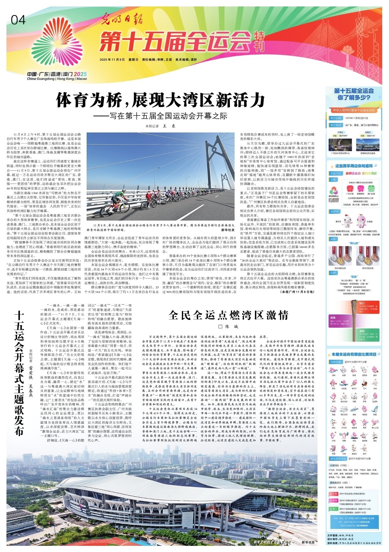 “激情全运会,活力大湾区”,粤港澳三地承办的十五运会,必将在中国体育史上留下浓墨重彩的一笔。我们期待,全国各地运动员在岭南大地上挥洒汗水、拼搏到底,我们也乐见体育成为广阔舞台,借此向世界生动讲述新时代的湾区故事、中国故事。
