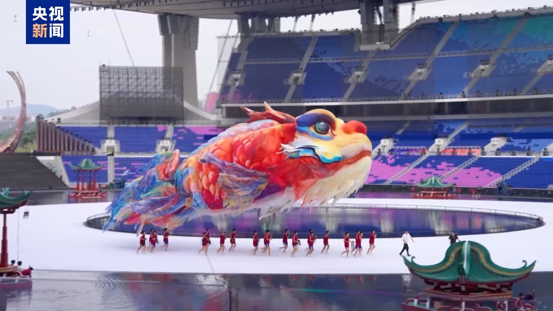 十五运会开幕式美术总设计 巨型鳌鱼原创设计者 尚天宝:这只鳌鱼的造型和传统意义上的鳌鱼有些许不同,保留了龙头鱼身,但是尾巴部分我们做了特殊的处理,把这种凤尾鲤鱼的大尾巴嫁接了进来,鱼鳍、鱼身参考了金龙鱼的鱼身,让它更好看,色彩上更岭南,发挥了岭南的浓郁用色的极致。
