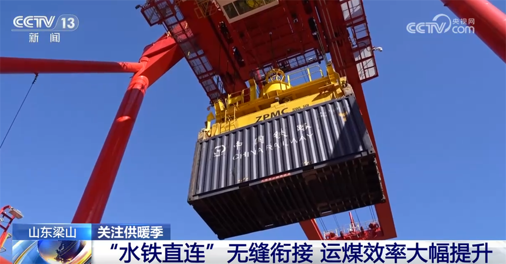 在现场,大家可以看到大型起重机正在往船上装集装箱,这是今年港口新推出的一种“水铁直连”的煤炭运转模式,就是把集装箱的煤通过铁路运到这里,不再经过卸煤和存储的过程,而是通过精准的需求调度把集装箱直接装船,通过运河发往目的地。这种方式大幅缩短了煤炭运输的周期,把整个周期从5天缩短到3天,也提升了港口能源保障的效率和能力。