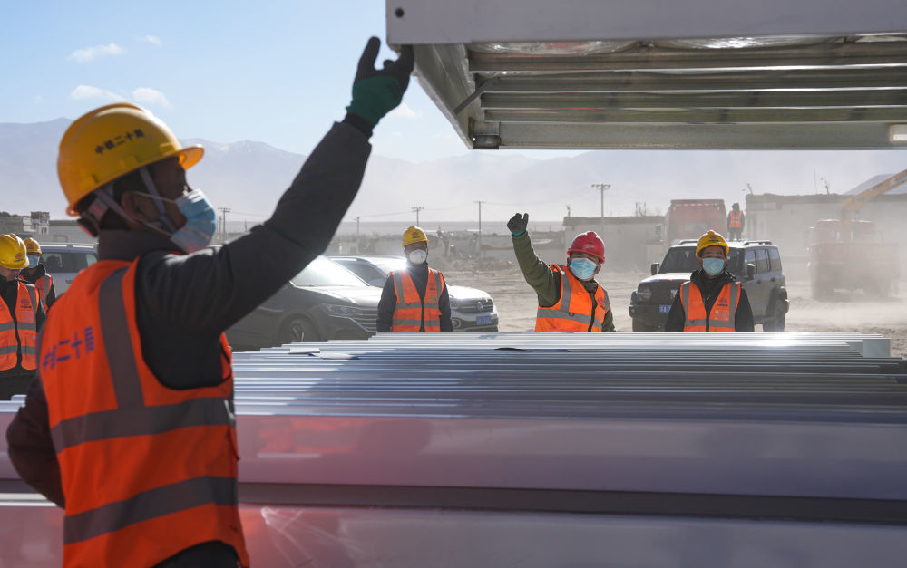 2025年1月9日,工作人员在定日县长所乡森嘎村搭建板房。