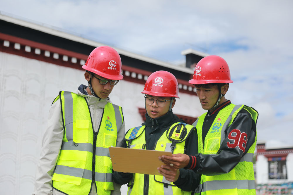 2025年8月10日,技术人员在中国中铁定日县曲洛乡措昂村民房恢复重建项目施工现场商讨方案。
