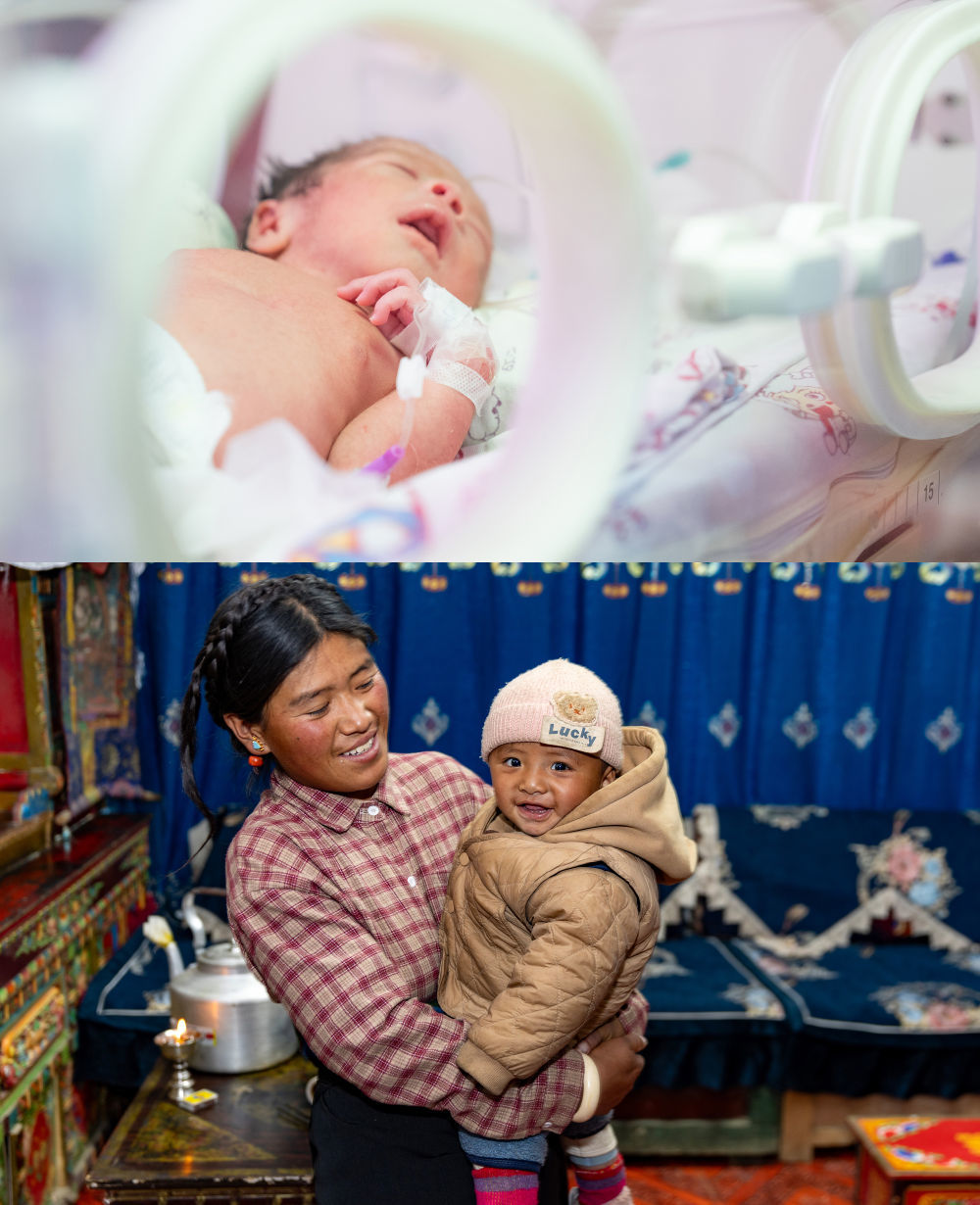 拼版照片:上图为2025年1月9日,地震中第一个出生的“地震宝宝”次仁拉巴(1月8日7时40分左右出生)在日喀则市人民医院新生儿科病房睡觉。下图为2025年11月11日,次仁拉巴和妈妈强琼在新房里。