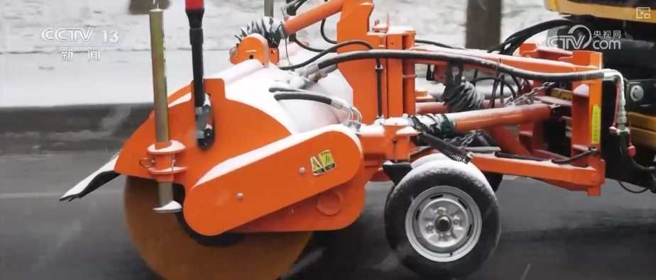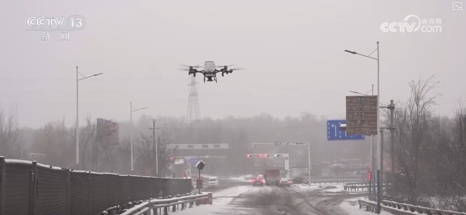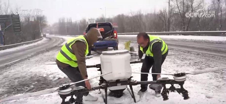 降雪致交通受阻 无人机大型机械撒盐除雪