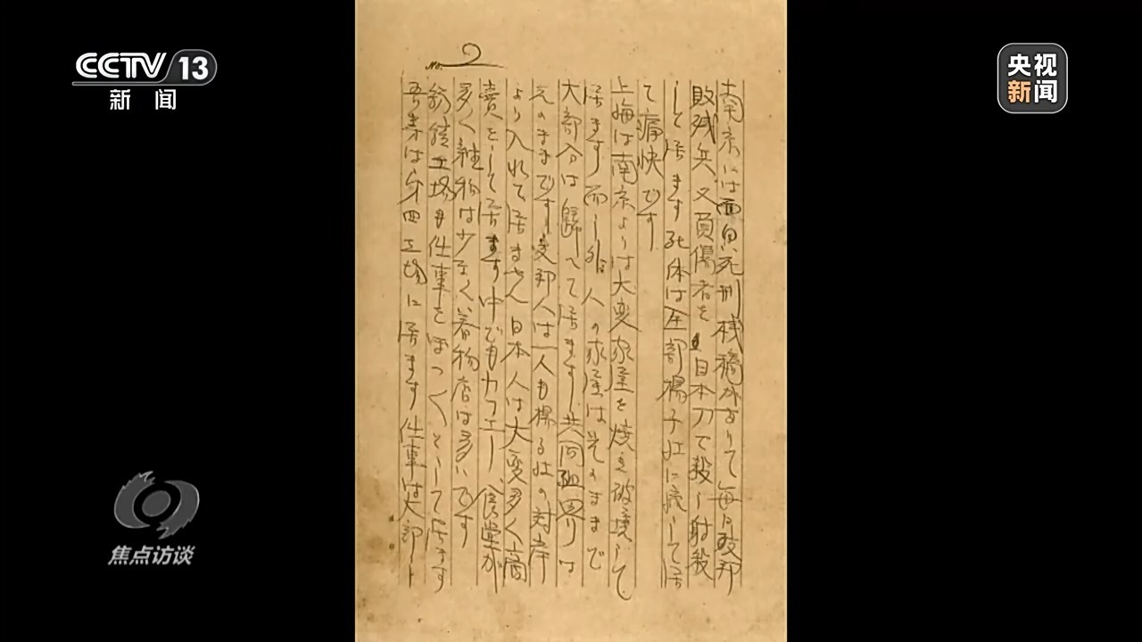 侵华日军南京大屠杀遇难同胞纪念馆文物部工作人员 蒋俊:这封信总共有4页,在第2页写着,南京有一个死刑栈桥,每天用日本刀刺杀或者射杀,把尸体丢到扬子江中。最后他还说了一句“真痛快”,完全就是一种没有人性的表述,非常残忍。