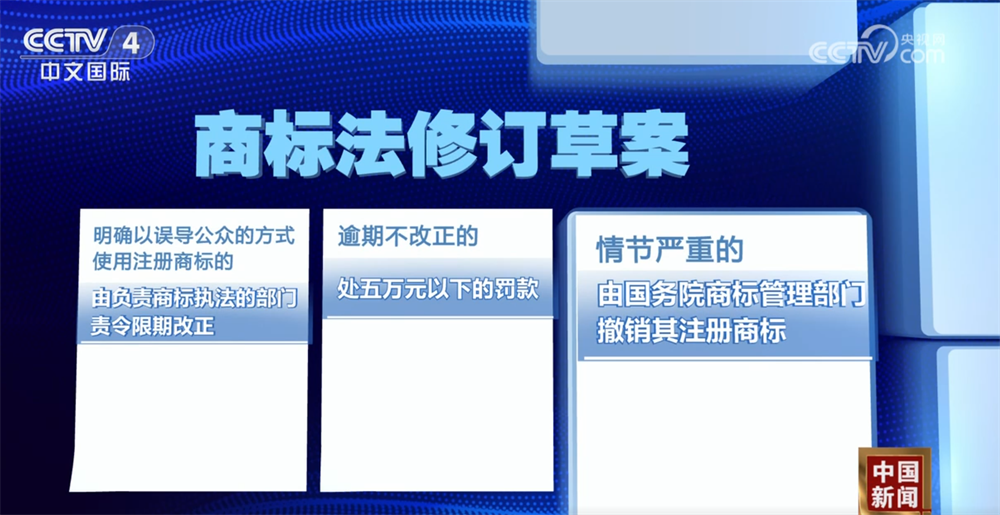 在强化商标管理方面,修订草案增加规定,明确以误导公众的方式使用注册商标的,由负责商标执法的部门责令限期改正;逾期不改正的,处五万元以下的罚款;情节严重的,由国务院商标管理部门撤销其注册商标。