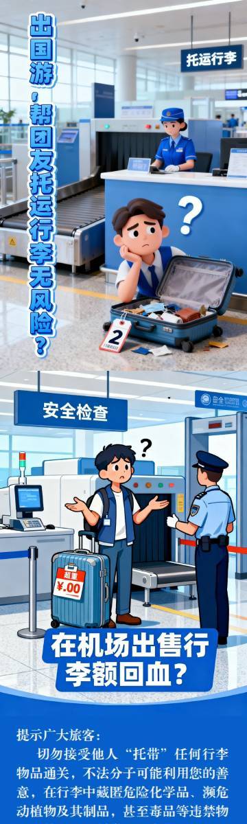 出境游已成为许多人假期休闲的热门选择。出行中,不少人认为“出国游,帮团友托运行李无风险”“可在机场出售行李额回血”,事实真的如此吗?警惕!不法分子可能利用您的善意,在行李中藏匿危险化学品、濒危动植物及其制品,甚至毒品等违禁物品。替他人“拖带”行李物品,一旦违法相关规定,可能面临严重法律后果。(作者:王法凯 推荐单位:北京海关)