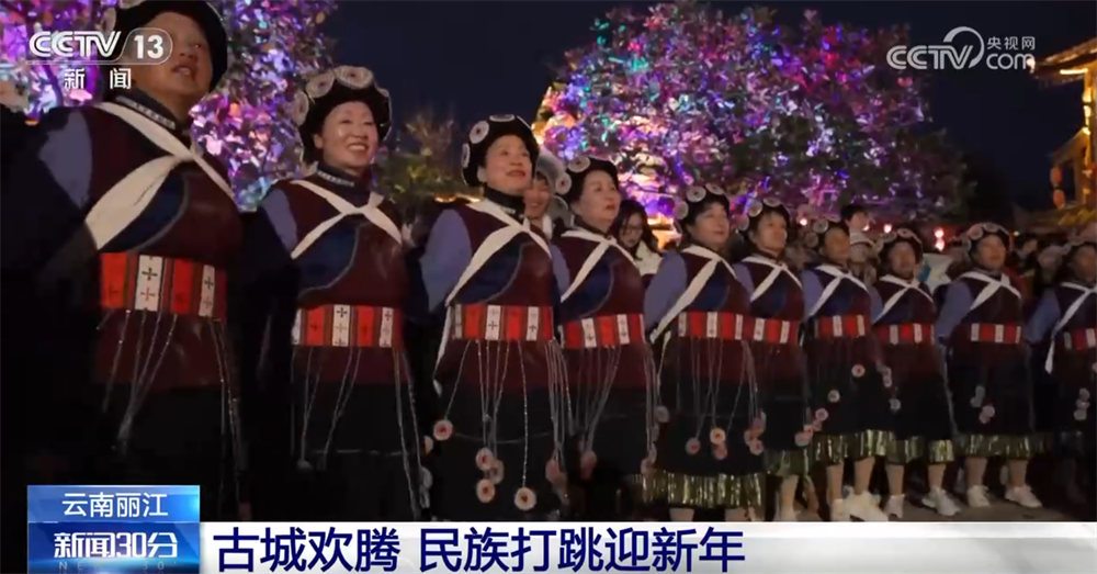 为迎接新年到来,丽江古城开展了云南特色的“打跳”舞蹈。在四方街广场,身着纳西族传统服饰的当地老百姓和天南地北的游客朋友们手拉着手,大家以篝火为中心,伴着音乐节奏一起舞动,温暖的火光映照在笑脸上,人们在热烈的氛围中期待新一年的到来。
