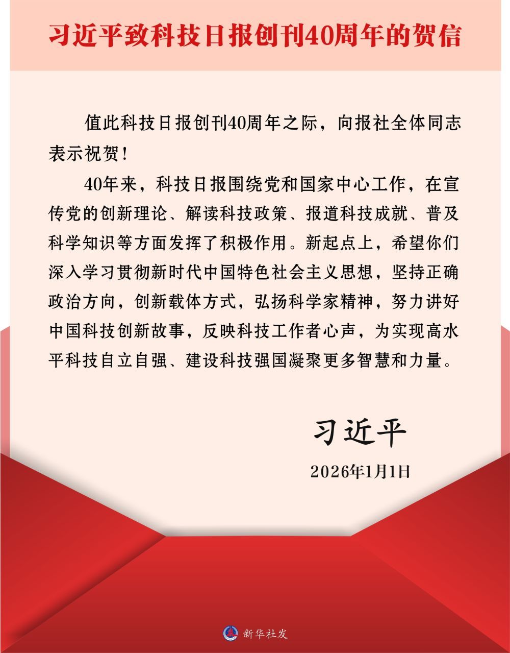 新华社北京1月1日电 在科技日报创刊40周年之际,中共中央总书记、国家主席、中央军委主席习近平发来贺信,向报社全体同志表示祝贺。
