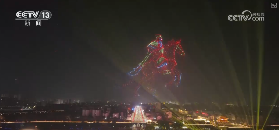 在荆州古城,2026架无人机翩然升起,以天为幕,勾勒出一幅幅绚丽的光影画卷。凤凰展翅,象征楚文化的涅槃与高远;赤兔腾空,呼应关羽的忠诚与神勇;关公横刀立马的雄姿,在夜空中凝结为璀璨祝福。整座古城流光溢彩、光影交错,展现出一幅古今交融的文旅新画卷。