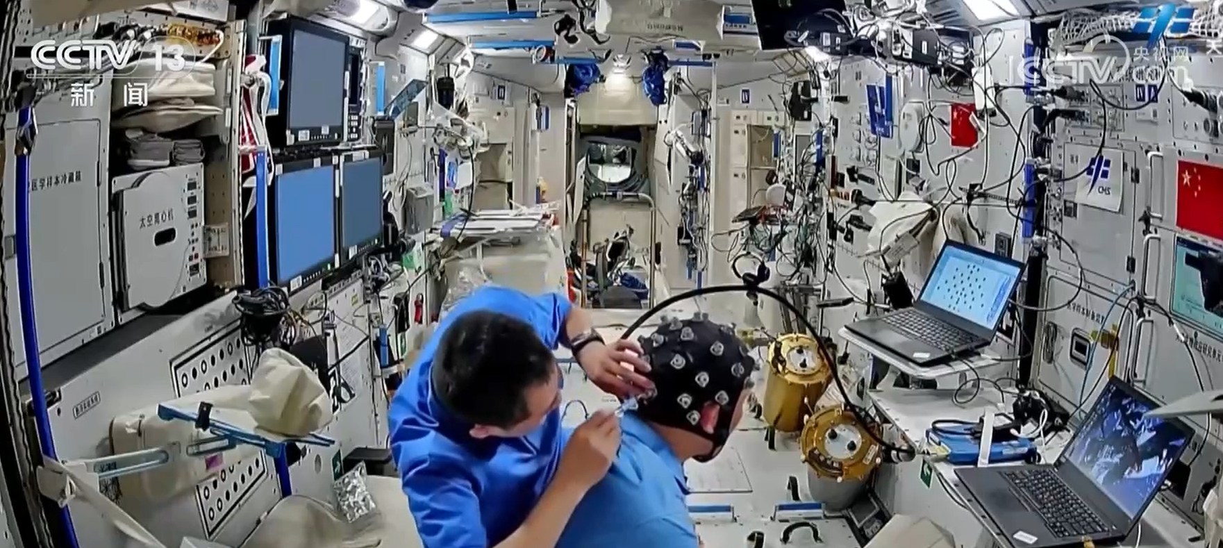 在轨脑电测试研究相关项目按计划开展,乘组利用脑电设备完成了上下视野研究、执行功能训练、探索利用研究等多个项目的实验测试工作;使用近红外脑功能成像设备开展空间脑网络时变特性实验,通过采集相关数据,开展长期空间飞行环境对航天员脑功能网络影响及大脑对外部环境变化进行了自发调整与适应机制研究。