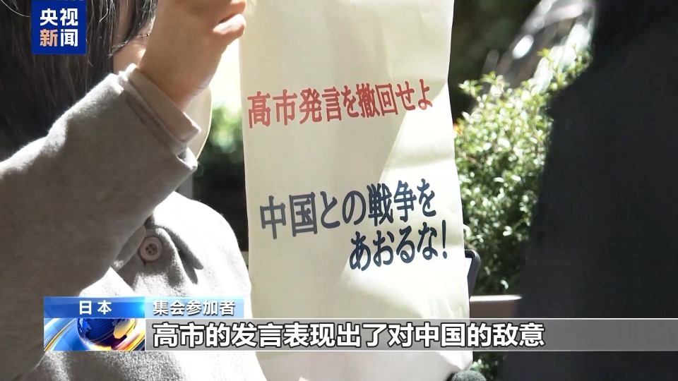 集会参加者:在国会这样一个正式的场合,高市的发言表现出了对中国的敌意。她是需要负责任的,高市必须在同样的正式场合撤回这一发言。